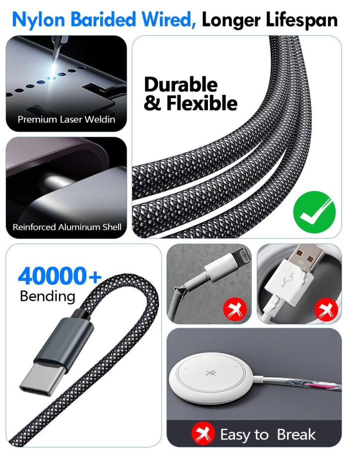 The 4-foot multi-charging cable offers seamless versatility with USB-C and USB-A compatibility,making it an essential piece for both travel enthusiasts and tech-savvy individuals. Designed to serve multiple devices including iPhones, iPads, Galaxy phones, and Apple Watches, this cable simplifies your life by reducing clutter and eliminating the need for multiple cords. It’s portable and fits comfortably into travel bags, making it an ideal companion for vacations, camping, and daily commutes.The high-quality 48-strand nylon braided material ensures enhanced durability, providing long-lasting use without fraying or breaking, while the strong magnetic adsorption of the Apple Watch charger offers precise alignment and steady charging.
